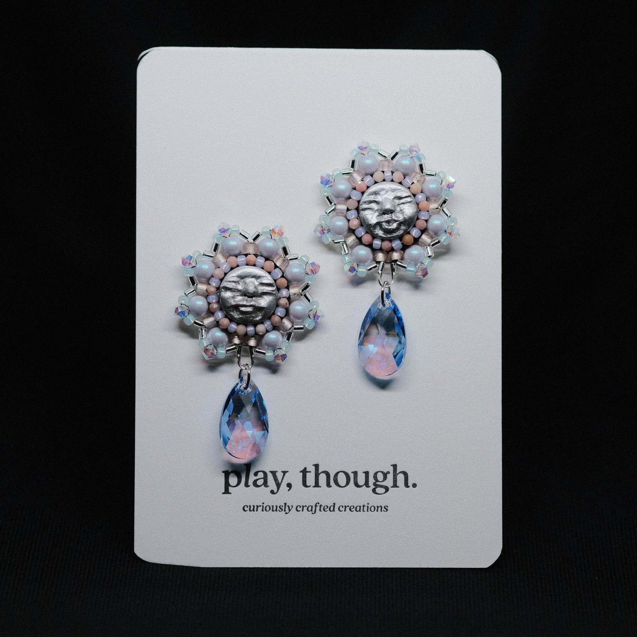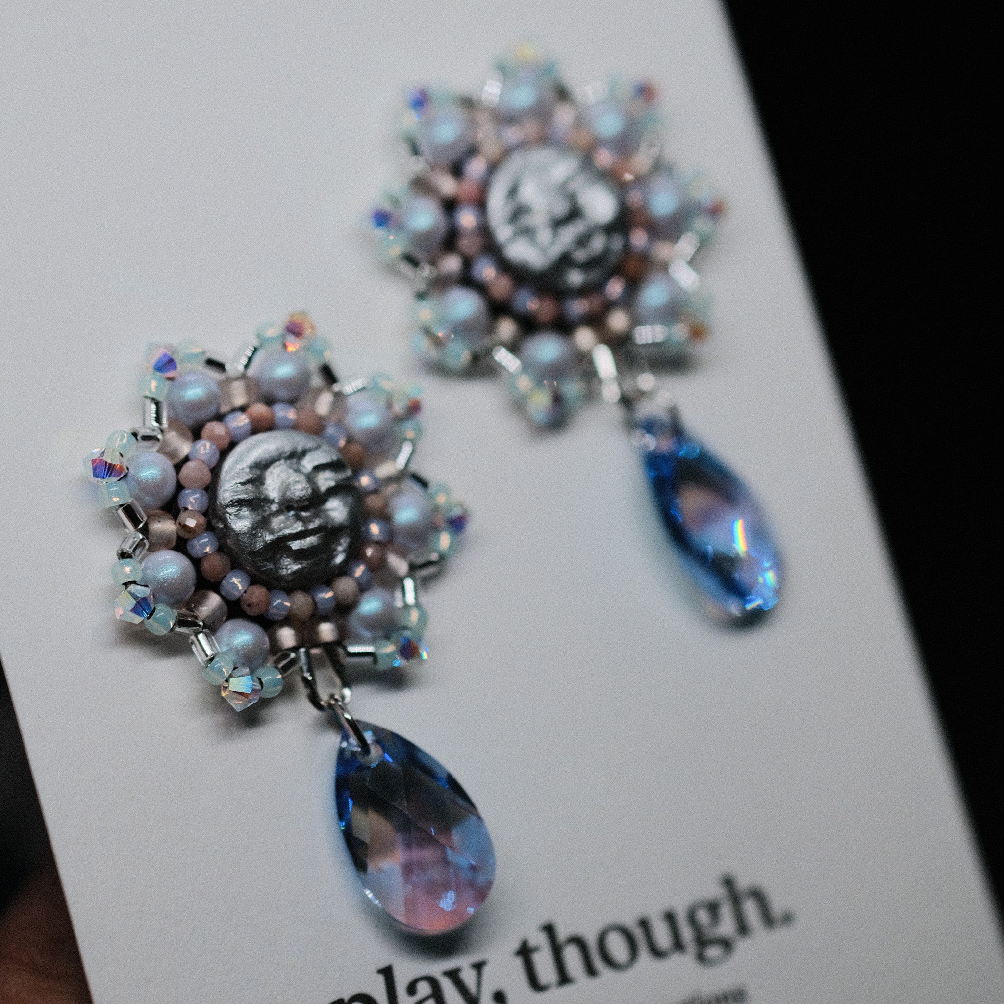 Materials: Polymer Clay, Mica Powder, Seed Beads, Swarovski Elements, Mini Mineral Beads, Faux Leather Backing, Nylon & Spandex Backing Cover, 925 Silver Wire Guards, Stainless Steel Posts