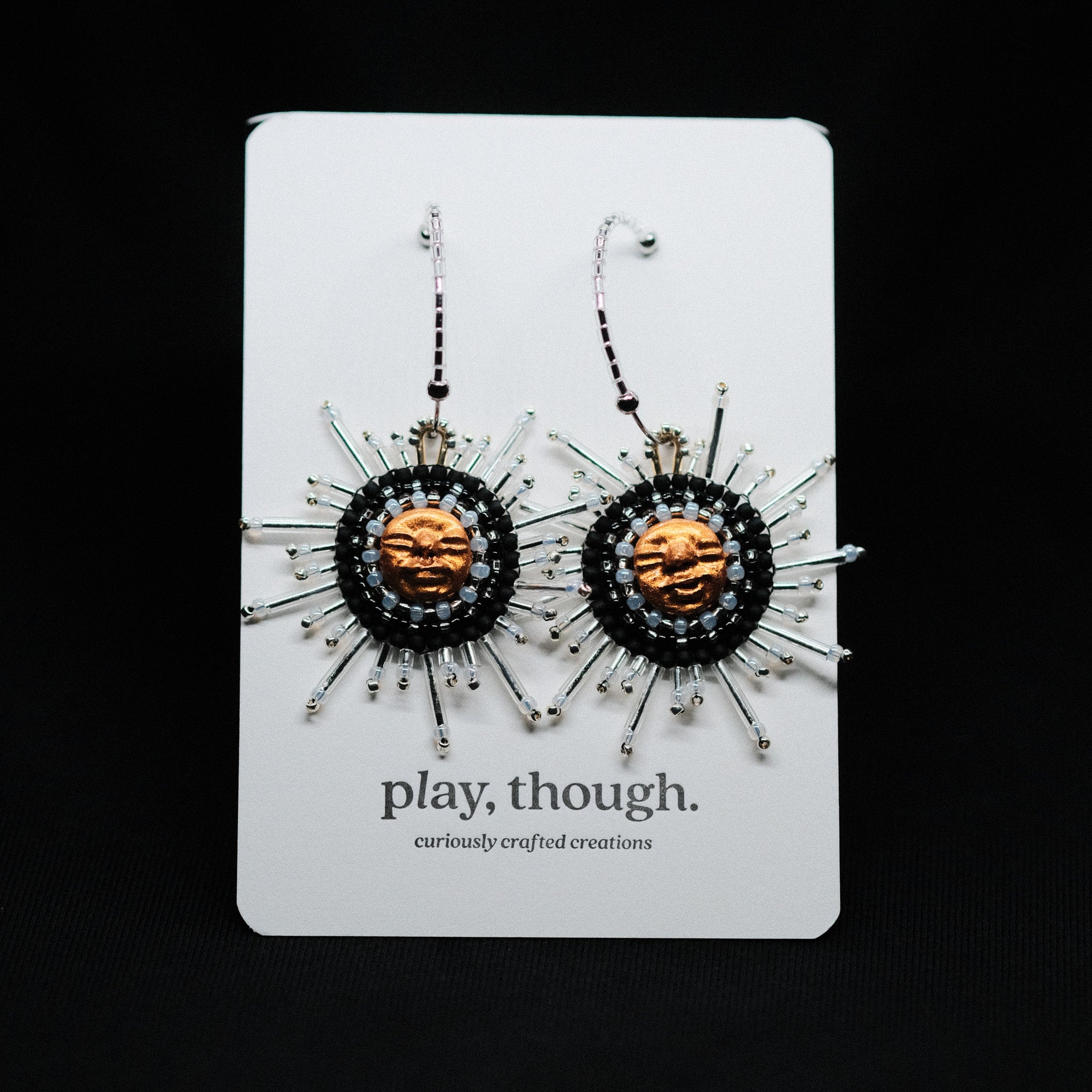 Materials: Polymer Clay, Mica Powder, Seed Beads, Swarovski Elements, Faux Leather Backing, Nylon & Spandex Backing Cover, Stainless Steel Hoops