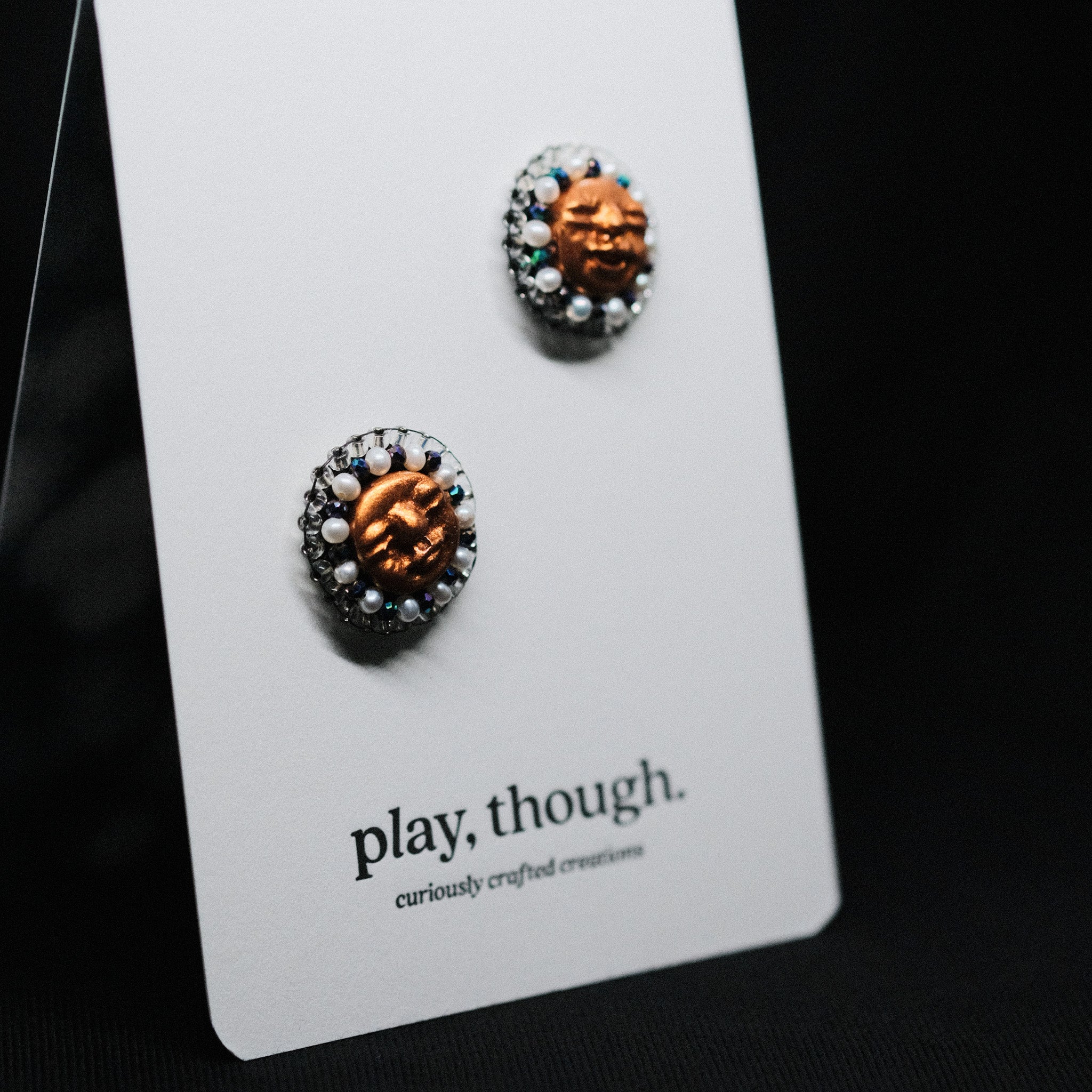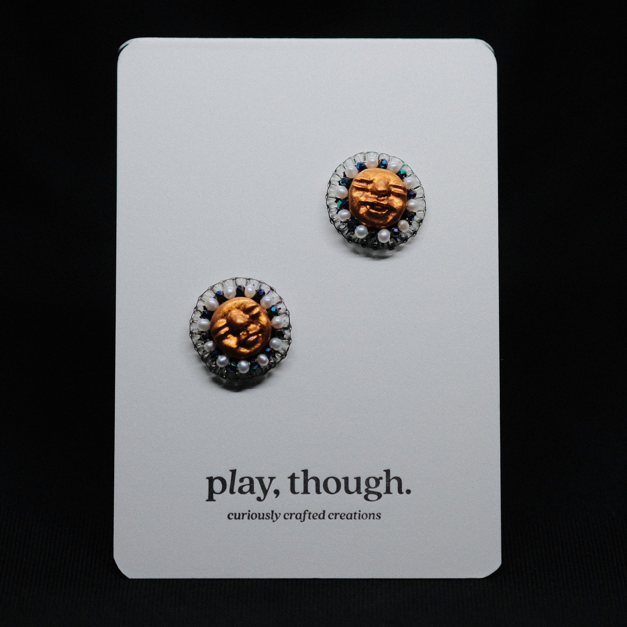 • Materials: Polymer Clay, Mica Powder, Seed Beads, Polished Glass Beads, Swarovski Elements, Fresh Water Pearls, Faux Leather Backing, Nylon & Spandex Backing Cover, Stainless Steel Posts