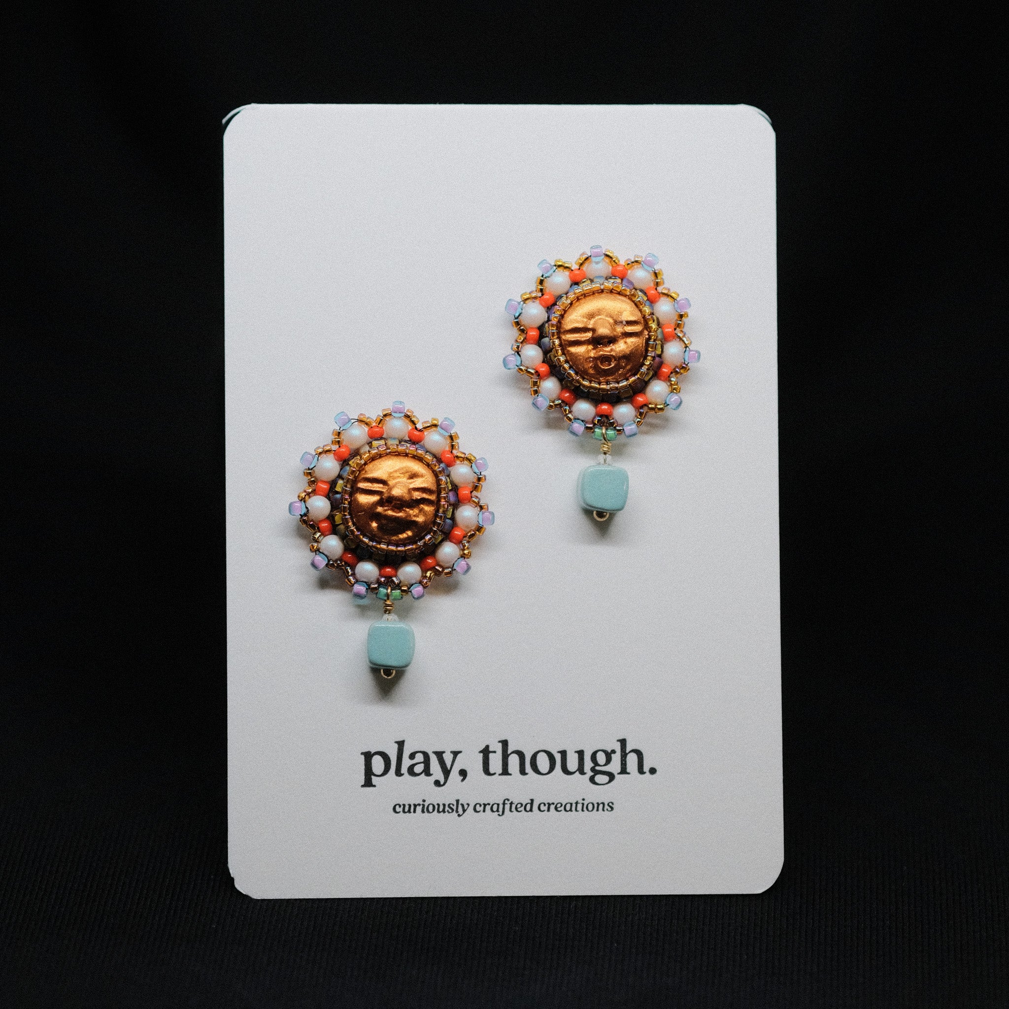 • Materials: Polymer Clay, Mica Powder, Seed Beads, Swarovski Elements, Handmade Ceramic Beads, 14K Gold-plated wire, Faux Leather Backing, Nylon & Spandex Backing Cover, Stainless Steel Posts